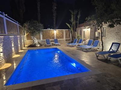 במתחם החיצוני בריכה פרטית מחוממת בעונת החורף, מתקן ברביקיו על גחלים ומתקן ברביקיו על גז, שולחן סנוקר אמריקאי, שולחן פינג פונג, מיטות שיזוף.