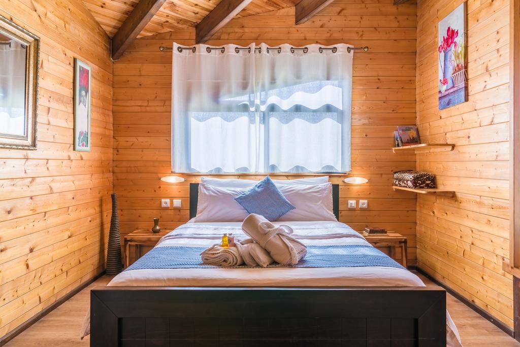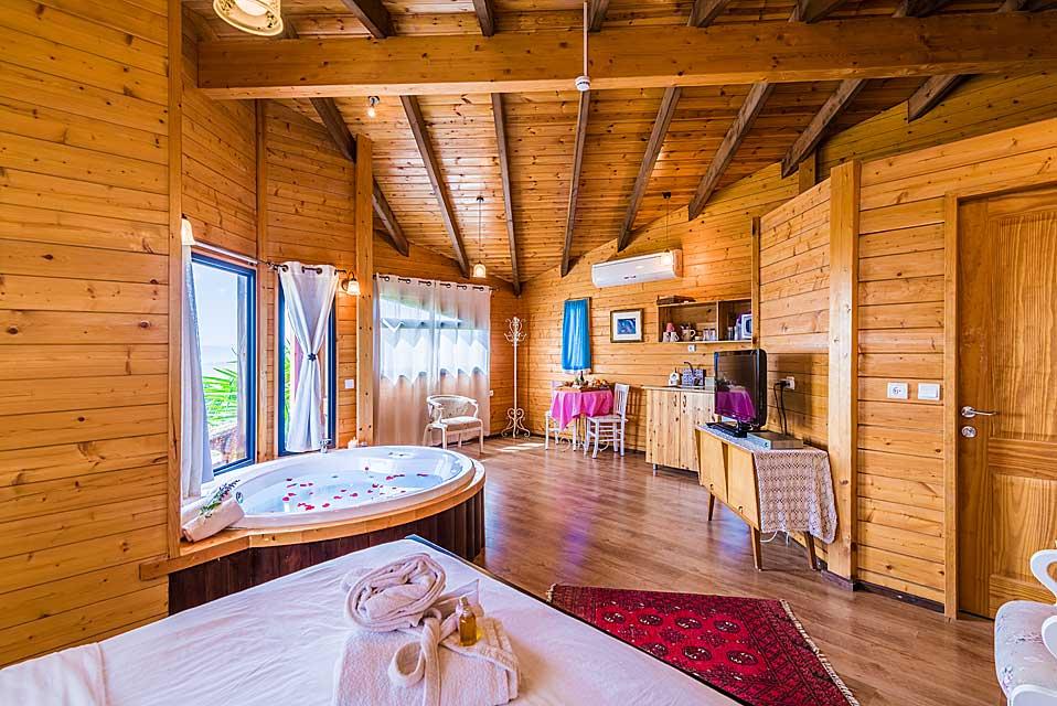 הבקתות הגדולות בנויות כחלל פתוח עם תקרה גבוהה, מעוצבות בסגנון טבעי, נינוח ומחבק ומכילות ג'קוזי גדול, מיטה מפנקת ופינת אוכל חיננית לצד המטבחון. לכל בקתה צמודה מרפסת דק אינטימית, הצופה אל הנוף.